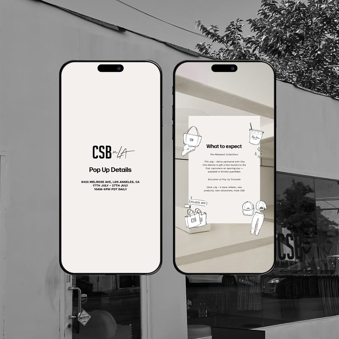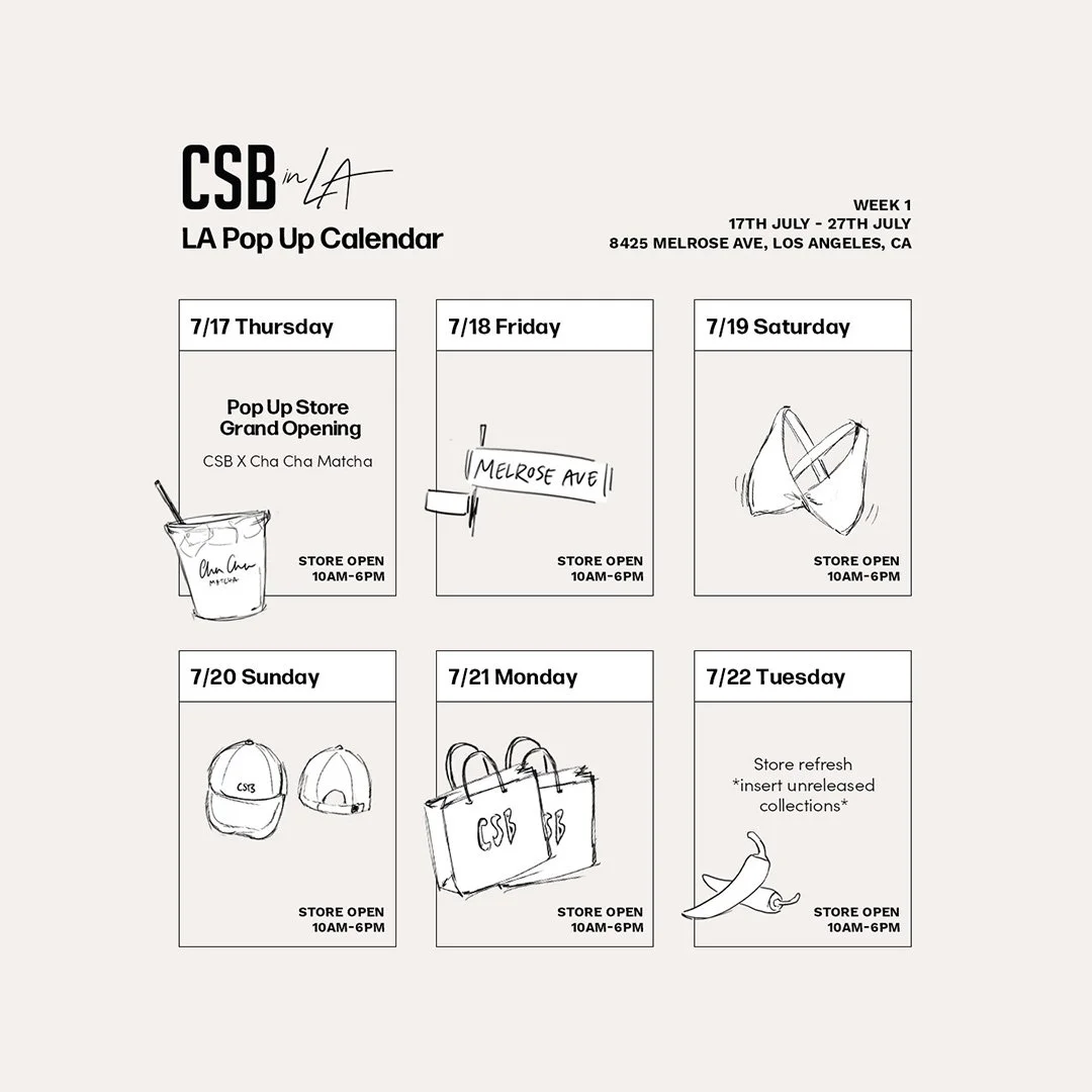 For CSB’s LA pop-up, a 10-day event on Melrose Ave, logo and branding were developed to include the “CSB in LA” logo, calendars, signage, merchandise, and packaging. A neutral palette and simple illustrations kept the look consistent yet lively.